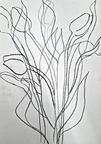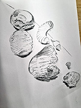Sue James Dean has a career background within art education and continues to work as a visiting artist in schools. She is passionate about the power of drawing as a means of communication. Sue invited us to this Workshop saying, “Come and enjoy an evening of expressive observational drawing. We will especially be exploring ideas of Space! Using tonal values and mark making to increase a sense of form, we will be looking at creating volume, structure and space!” Sue has run many workshops for us and brought along some natural form items for us to draw, (rocks/shells/twigs), and had asked us to bring anything that we wished to draw, especially items that have an inside/outside focus! She showed us a series of her own drawings and some by Henry Moore where he had used contours to define the shape of the stone he was drawing. His wartime “Underground” drawings used this technique to good effect when drawing the human form. Moore’s drawings of stones and flints greatly impacted on his sculptural forms.