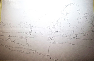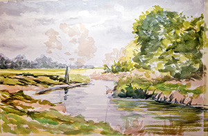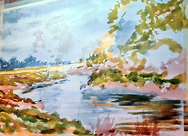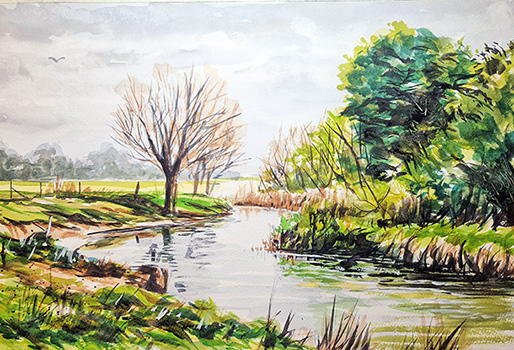 Mike Rollins is a professional artist, tutor and writer based in Hertfordshire. His style of landscape painting is a mixture of traditional and expressive techniques using a variety of mediums, including watercolour, acrylic and oils. He demonstrates and runs workshops locally for art societies and education centres. His work has also been featured in several magazines, including 'Leisure Painter' magazine, to which he is a regular contributor of articles. Trained as a scenic designer, Mike often visualises the subject as a stage set, open to rearrangement for dramatic purposes. He rarely paints a location exactly as he finds it, preferring to alter weather, lighting or viewpoint to suggest an alternate narrative. His chosen scene for this demonstration is one of his own photographs of a chalk river in Biggleswade. The river bank has silvery, grey-brown mud due to the chalk. He feels that using one’s own photographs is key as there is a memory and connection to the scene which can be drawn upon.