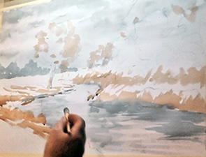Using Bockingford 300g paper, taped to a board which was held vertically on an easel, Mike did a rough sketch of the river bank, background trees, large bushes to the right and a dominant group of trees left of centre. Using a vertical format is challenging but ideal for demonstrations. He had a large palette laid out with a restricted range of Windsor and Newton student grade paints. Having wetted parts of the sky area he uses a light wash of Ultramarine Blue and Burnt Umber, using a large brush and leaving bright unpainted areas. Clouds come in all shapes and sizes – his marks are rough and random. He catches any drips with a dry brush. Mike echoes the sky colour in the foreground water. He intensifies these areas while the paint is wet, lifting out some paint here and there. Once the sky area is dry he adds paint with more Burnt Umber added for depth, adding horizontal marks on the water and the distant treeline. He next uses Burnt Sienna for warm tones on the fields and foliage, Cadmium Yellow to distant fields and other areas.