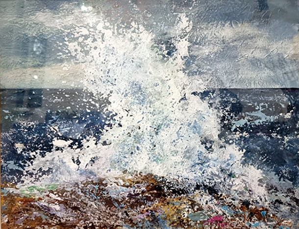 These are some remarks from Members present on that evening: “Astonishing” “Loved it. Very informative, accurate. Criticism very constructive.” “Helps with composition” “Fascinating. Thorough, brilliant analysis” “Interesting but I prefer a real person” Members voted as usual for their favourite images. The Winner was ‘Anarchy at Betty’s Bay’, a bold wave breaking on shore by Alison Wright executed in acrylics. Alison’s work is shown below with the full AI report. The Runner-up was ‘Pages of Peace’ an abstract figure by Amanda Cosgrove. Since all the reviews were so interesting they can be viewed in full with the images by the artists. Mike Lawrence was thanked for facilitating this AI Critique. It was certainly a very different approach for a Critique evening and provided an alternative means of receiving feedback on one’s work. Mike mentioned that this facility can be used to seek advice while work is in progress, perhaps when reaching “a sticking point” some suggestions by AI on how to progress may be worth considering.