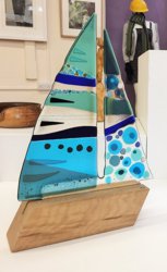The glass and wood piece, ‘Set Sail’ by Niko Brown drew me in first. Its shapes, refractions and shadows, shimmering as the sun intensified and receded seemed to make the piece alive with light. Mere melted sand and pigment but brilliantly combined to show real character. The stunning, vibrant colours cleverly fashioned described the form, but also revealed the surrounding landscape as the boat sails by. Housed on a wooden base, the grain of which echoed the shapes of waves rhythmically moving past. A fresh and lively piece, technically challenging I feel sure, full of charm and wit.