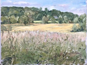 “I always enjoy the Tuesday evening sketching sessions where we visit parts of Herts and spend a quiet hour or so painting or drawing. As I live in Welwyn Garden City and can't get going before 7pm some of the sites are too far for a rapidly darkening evening. So on occasion I visit more local sites instead which accounts for the Welwyn Viaduct and the harvested cornfield. The tractor in a barn at Parndon Mill was also produced during a separate daytime excursion. Of the summer's sketches I think I like this one best and might get a bigger oil out of it.