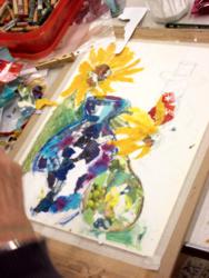 Having thoroughly wet the paper, David used the individual colours, raw sienna and cobalt blue to create greens, burnt sienna and cobalt for soft greys. Having laid down the first washes, he lifted out highlights with a large flat brush. When the first wash was dry, David added more colour, working from the top and blending the colours to intensify the grass area and add form to the cat, constantly softening edges to ensure that the cat was part of the landscape. The last stage involved building up the form of the cat, adding the cast shadow with a few flicks to indicate grass. Final touches involved detailing the tabby’s stripes, completing the details of the eyes and face (the most important aspect of the painting) and lifting out the whiskers. David was thanked for a very enjoyable evening. His technique of gradually building up the image with washes, adding colour when wet and ensuring that the image of the cat “sat” comfortably within the background produced a lovely soft image of Scoot. This needed planning, good preparation and speedy, confident execution - David certainly gave us a good example of how to approach watercolours in this way. Kathy Burman No Brushes Allowed! Workshop with Helen Kaminski – 14th October 2014