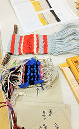 Elizabeth Murton is an award winning multi-media textile artist. She works in a creative and dynamic way – researching, drawing, crafting materials, talking with project partners and engaging people through events. She has a studio in Digswell and offers tutorials in various techniques on the internet. Elizabeth opened the session with a very interesting introduction to her work and practice – one intriguing example involved a huge warp weighted loom set up with fibres anchored with stones (ancient technology = contemporary sculpture). Many of Elizabeth’s projects involve unorthodox weaving techniques and materials but this workshop focussed on teaching the basics. Members had brought a variety of frames and materials (yarns, textiles, paper) and Elizabeth had brought along resources to get everyone started on a simple piece of weaving.