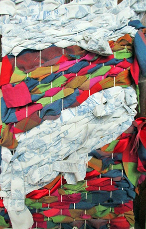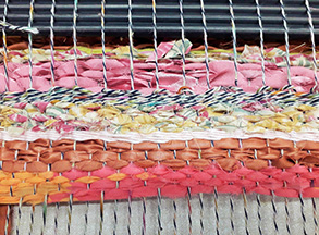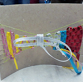 Members then made choices of materials and colour scheme and began to weave rows of yarn, ribbon, paper or torn fabric (the weft) through the warp threads, either using each thread or odd numbers to form a pattern. One Member used cut strips of cardboard, another an unravelled bath scrunchy (anything goes!) and very soon work started to take shape.