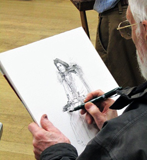 Roger Dellar is a self-taught artist with a keen interest in people and their behaviour. He is fascinated by the way the play of light transforms a subject; either working in the studio or plein air. He is a member of The Royal Institute of Painters in Watercolour, The Pastel Society, and The Royal Institute of Oil Painters and an active member of The Wapping Group. He is a regular visitor to the Hertford Art Society and his demonstrations are always popular and very well attended. Roger paints on hardboard, primed with 3 coats of a dark white Gesso which appear lighter as he starts to paint in his initial dark tones.