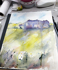 Tonight’s project is to replicate one of Mike’s paintings, a rather bold image based on a photograph taken of a group of houses positioned at the top of a hill, with rough grass leading up to the buildings and an intense long shadow cast down the hill from a low sun behind them. Mike began his demonstration by quickly sketching in the forms with a fine brush and ultramarine paint. He then filled in the shapes of the houses, the cast shadows and trees etc along the horizon with a strong mix of the same paint. This quickly established the dark tones which would subsequently be overpainted. The image of the photograph was projected onto a large screen and Members began to follow Mike’s steps with their own paintings. Next he laid in the sky with pure white paint on the right hand side and cerulean blue on the left, blending and adding some depth to the sky. Mike likes to use pure colour and the next step was to add a bright yellow “undercoat” to the field leading up to the houses. He worked swiftly with broad strokes and encouraged us to use the largest brush for these initial areas. These early stages can be seen in the photos below.