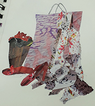 Showing us some examples of her own work Sally encouraged a free approach using large torn or cut pieces of printed material in order to accomplish something worthwhile in the short time available for this session. We were advised to do a quick sketch in pencil and then think of a suitable colour palette. The joy of using a variety of magazines is that the most unlikely photographs or patterns can be torn and used in a creative manner in order to create the form and features of a chosen image.